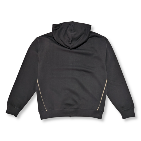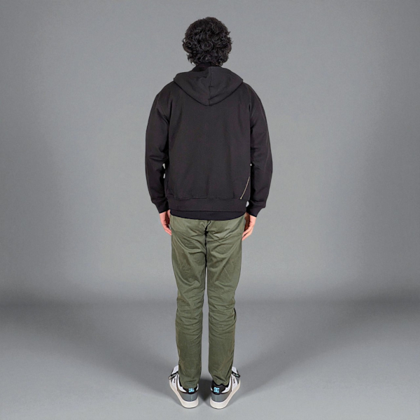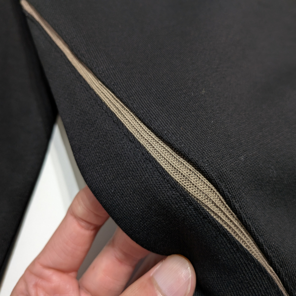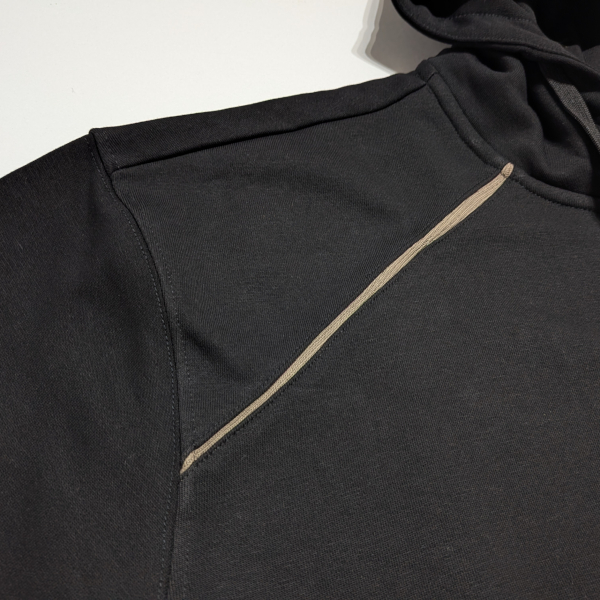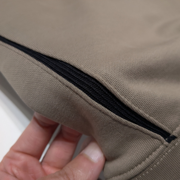 実はこのディテール、両脇の後ろ側にも施されています。これにより、後ろ姿にスタイリッシュなアクセントが加わり、単なるリラックスウェアで終わらない洗練された雰囲気を演出してくれます。