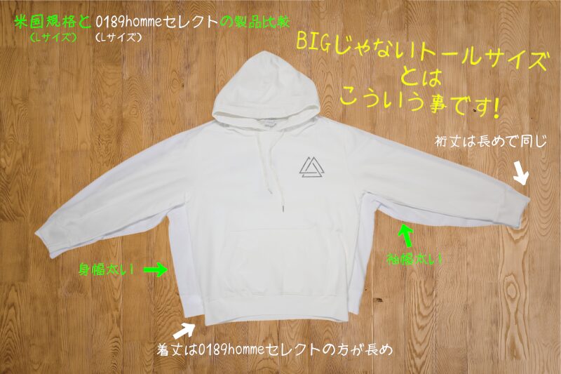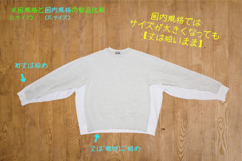 一方で、身幅、袖幅については国内規格(XL)とほぼ同じです。