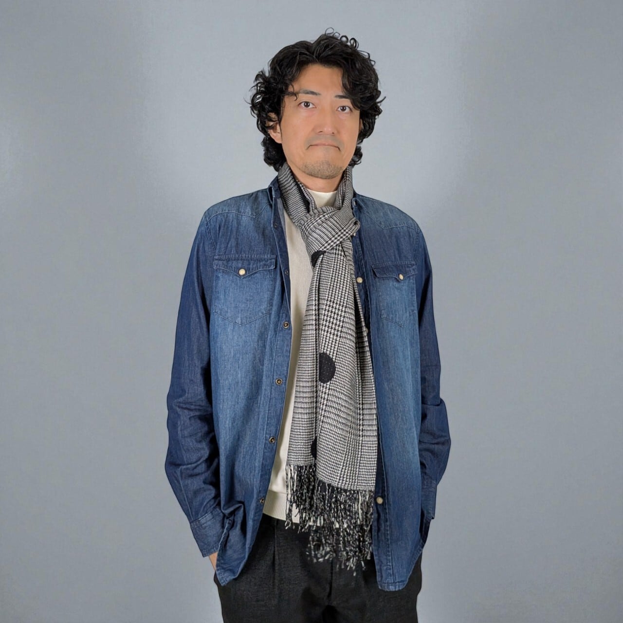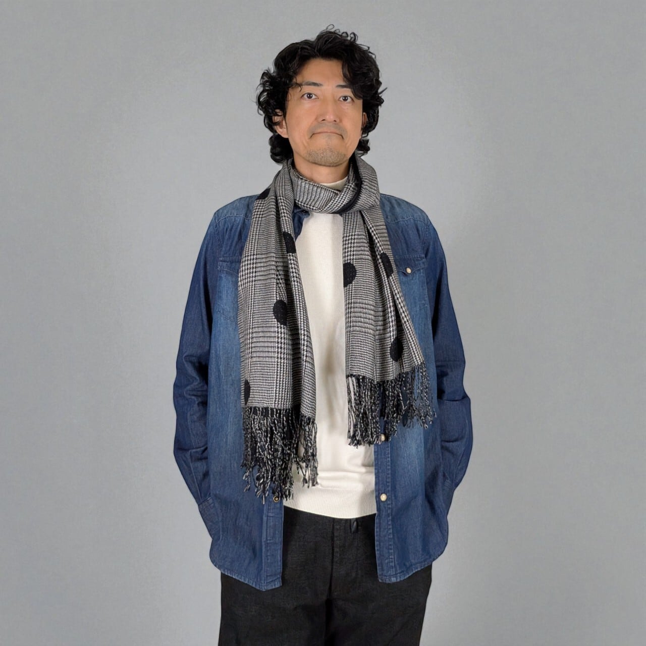 グレンチェックの地にドット柄を配したロングスカーフ。