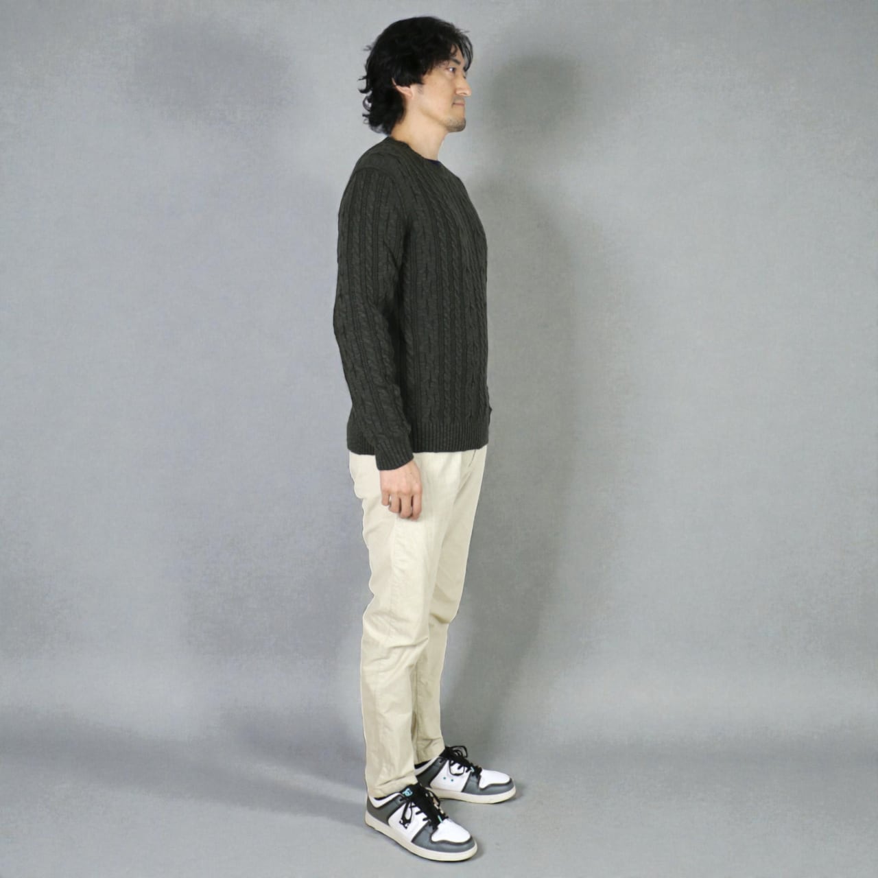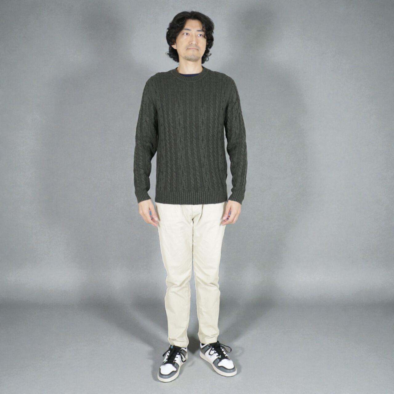 きちんとサイズ感の合ったセーターをさりげなく着こなせる。袖丈や着丈も安心。