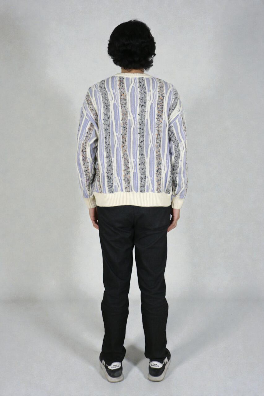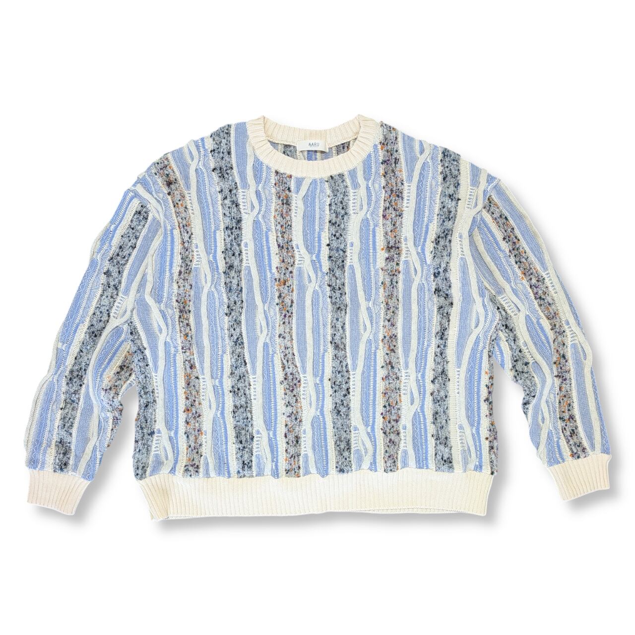 特徴は、表情豊かな“クージー柄”と、立体感のある3D編み。ブルー系の色彩を基調に、マーブルのように入り混じった編み地が視覚的にも暖かく、1枚で主役になる存在感です。