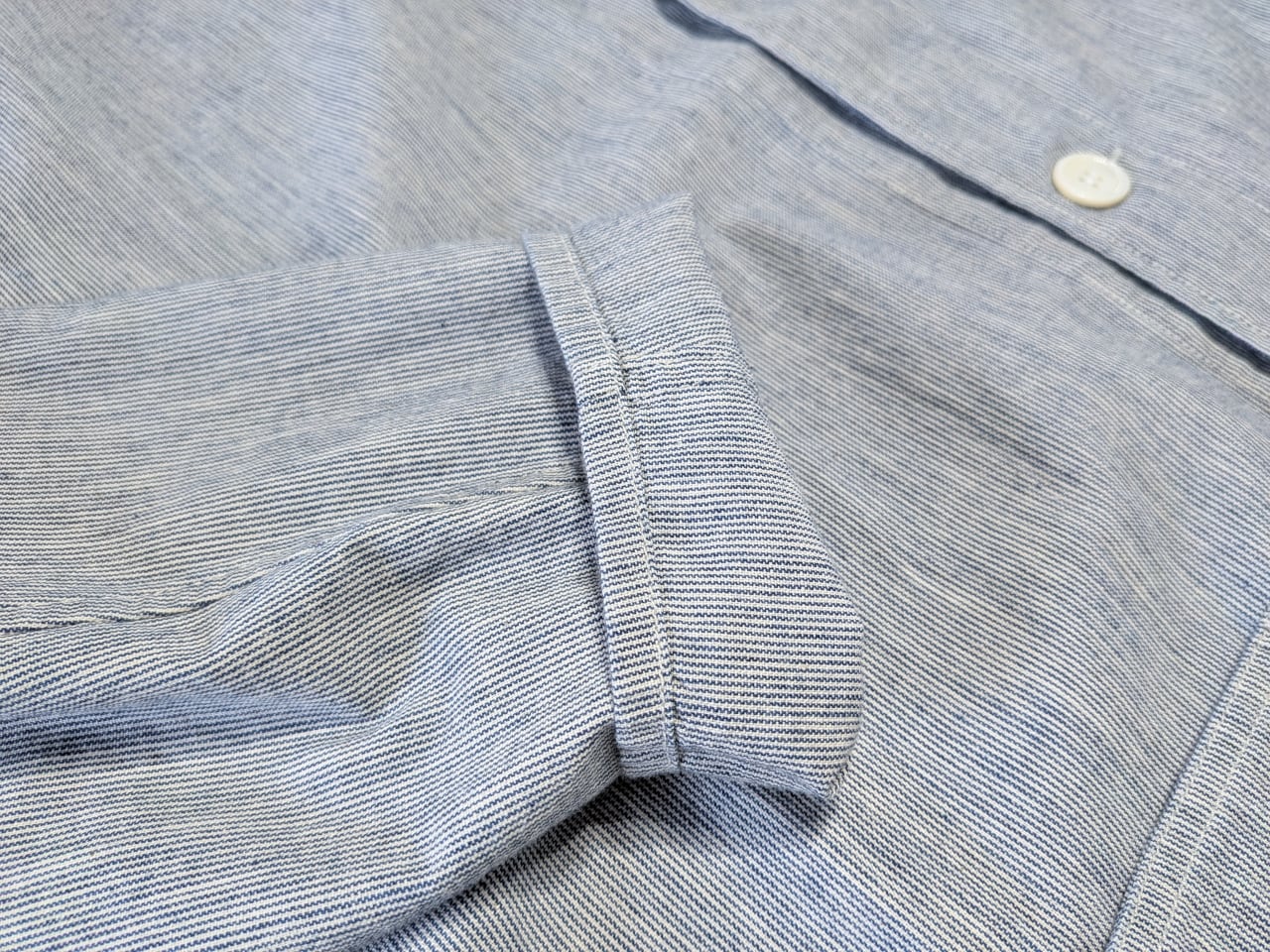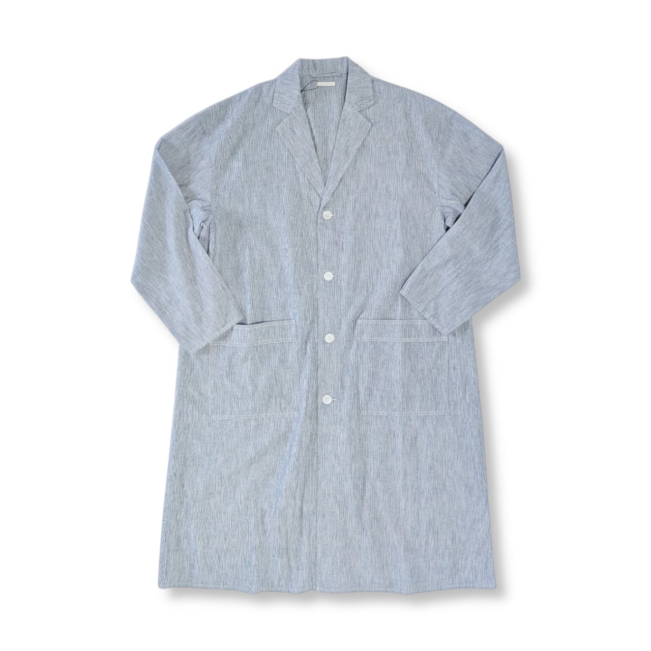 紺色の細いストライプが入ったヒッコリー素材は、ワークウェアらしい表情を持ちながら、重たく見えない。綿100%のダンガリー生地は春夏にちょうどよく、なつのシャツのように軽く羽織れます。さらに、たっぷりとした生地の分量が、動いた時にきれいな揺れを生み、長身の細いラインを魅力として引き立ててくれます。いつものコーディネートに足すだけで、見慣れた服合わせが少し新鮮に見える。そんなアクセントとして選んだ一着です。