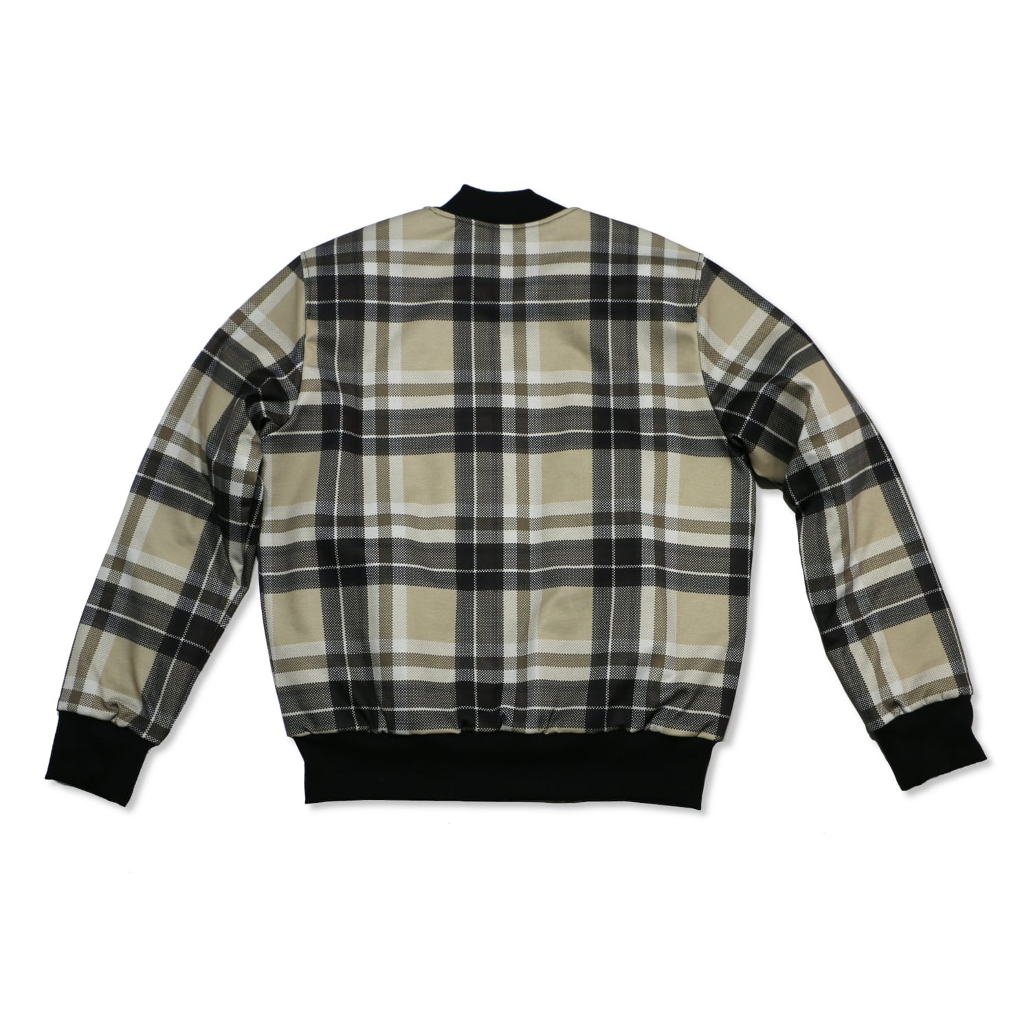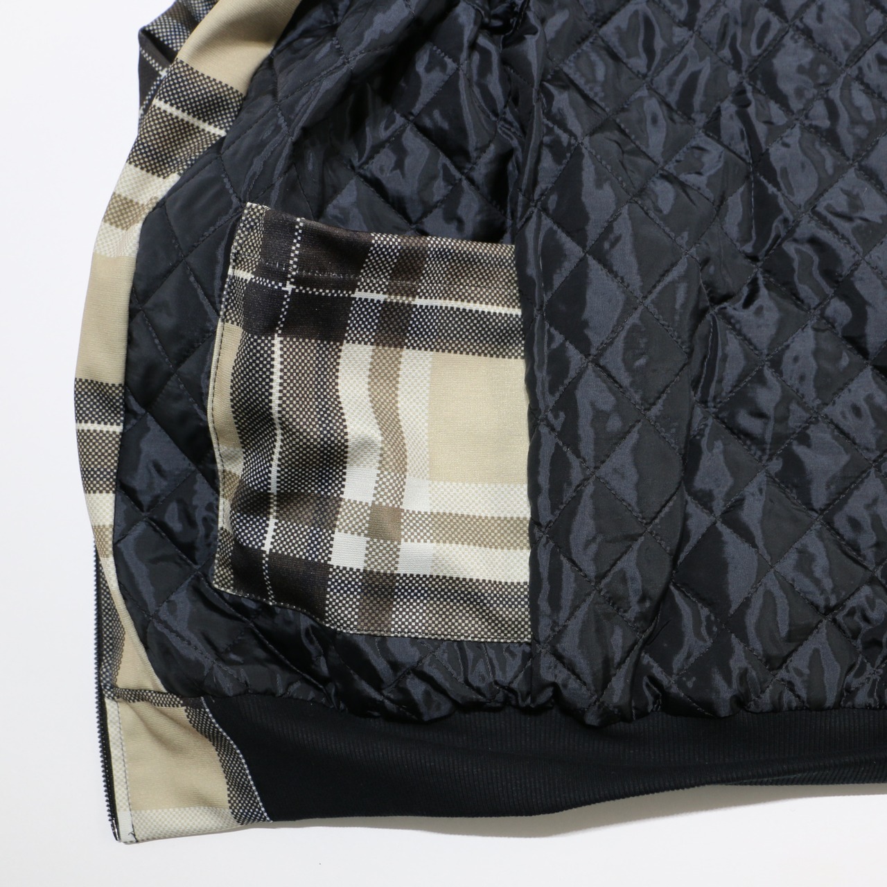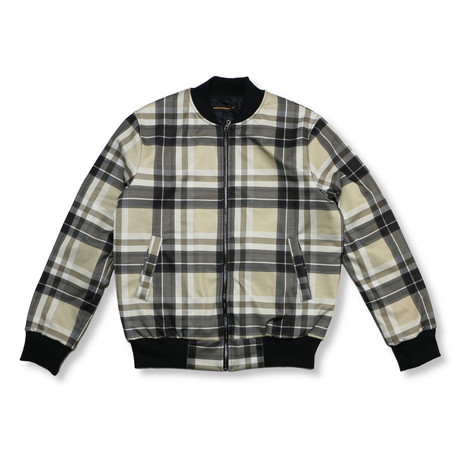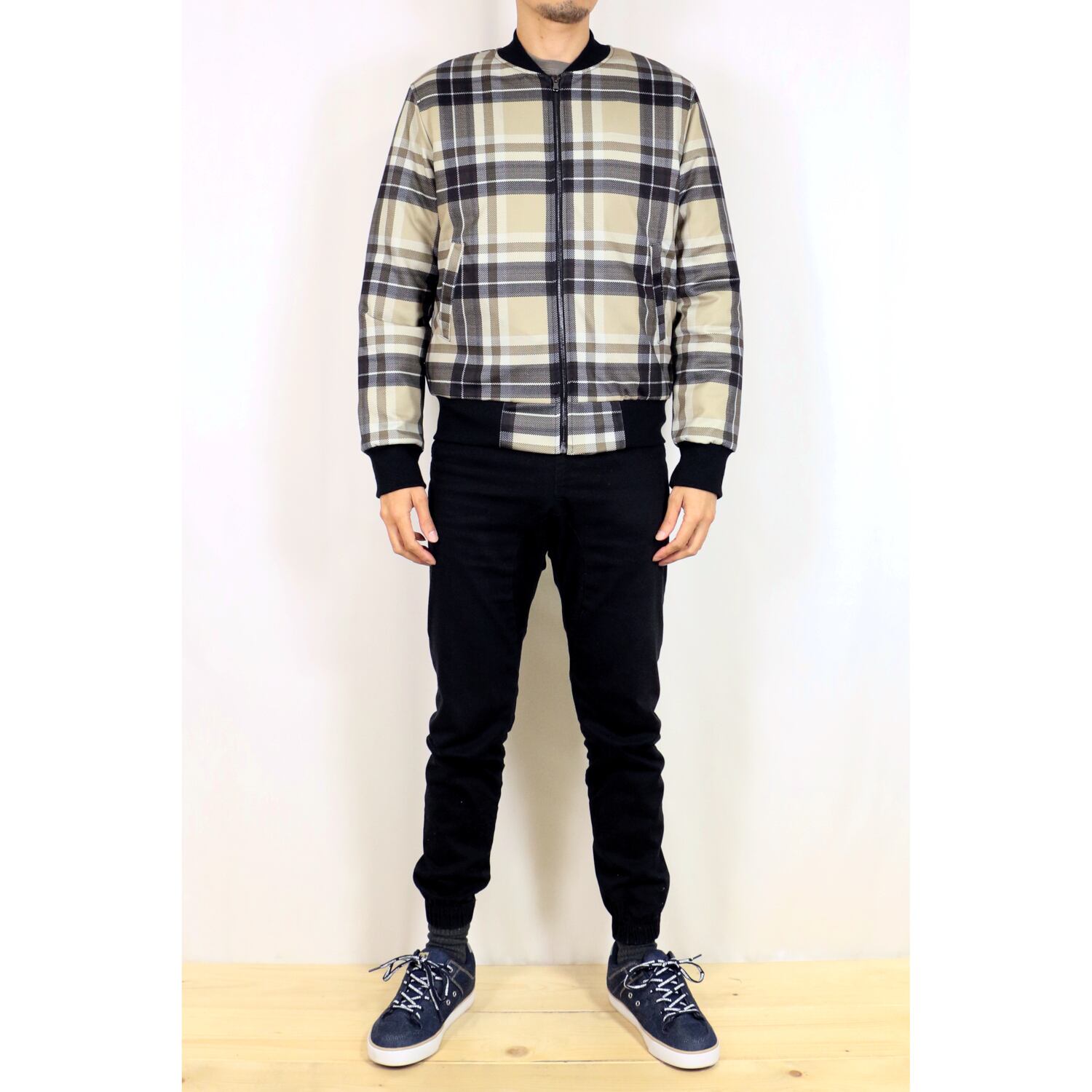 定番のMA-1風デザインに、オシャレなチェック柄を合わせたブルゾン。メッシュ風の織り柄でスポーティーなイメージ。普段着からオフィスカジュアルまで。内側は中綿キルティング仕様で防寒着としても使えます。表地と同じ生地の内ポケット付き。