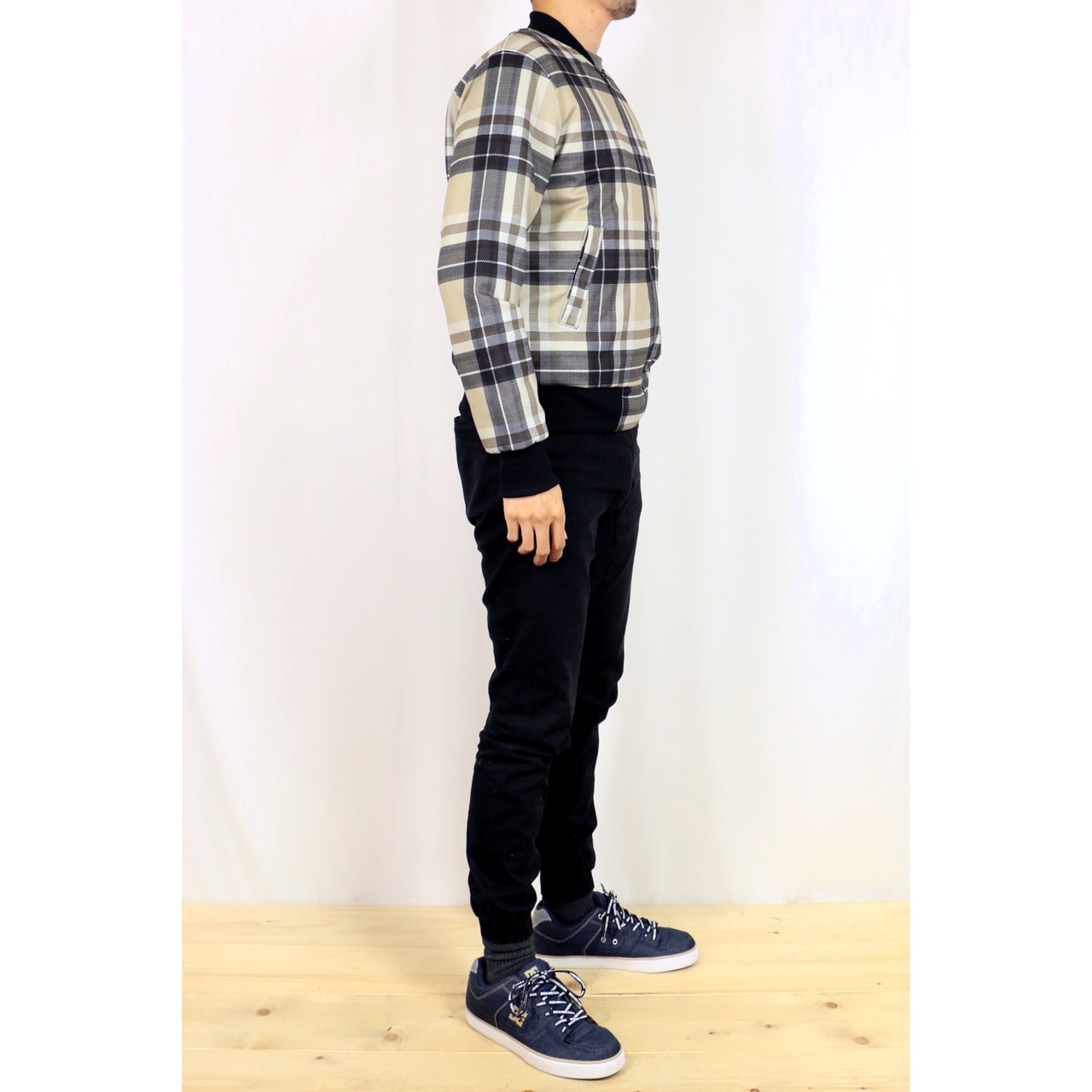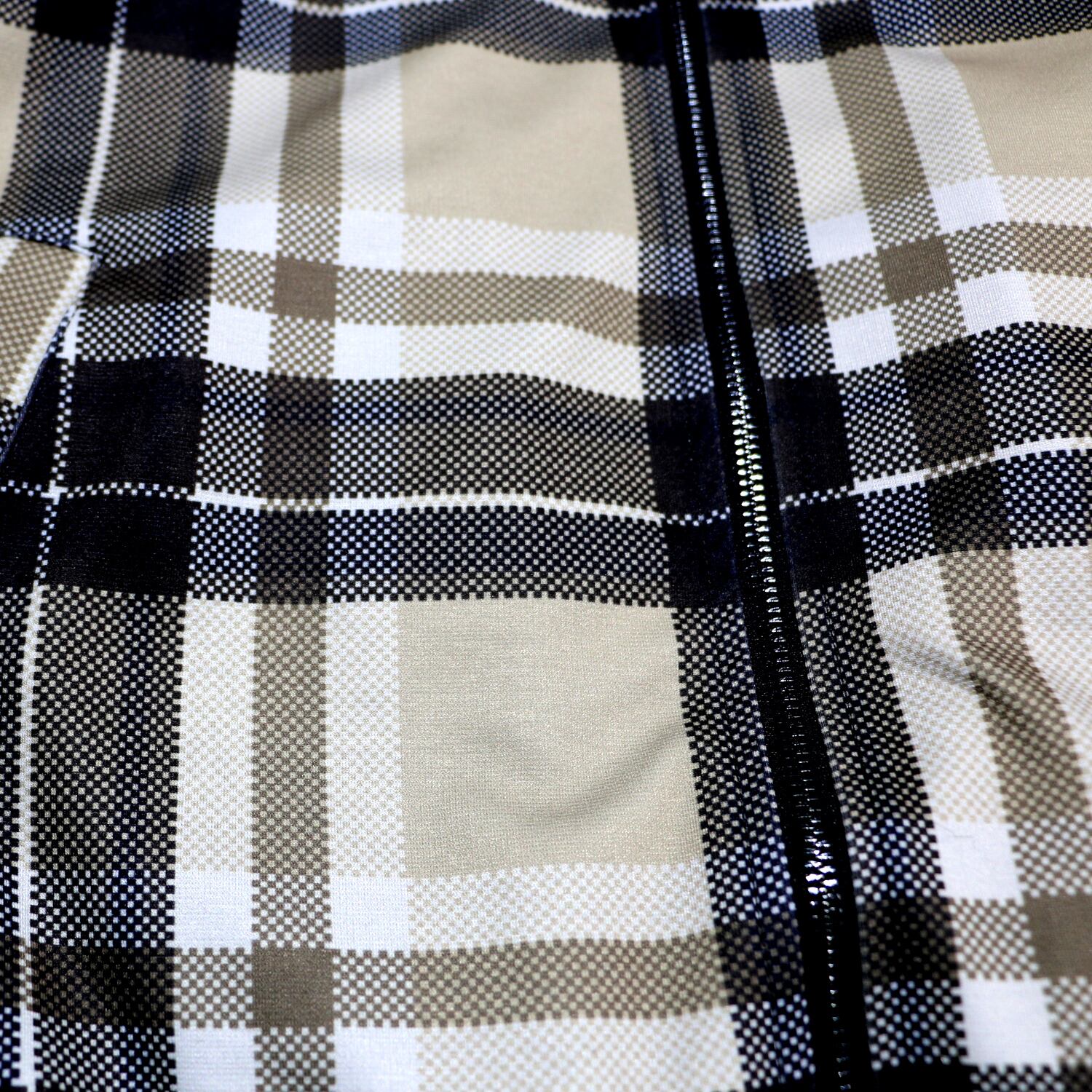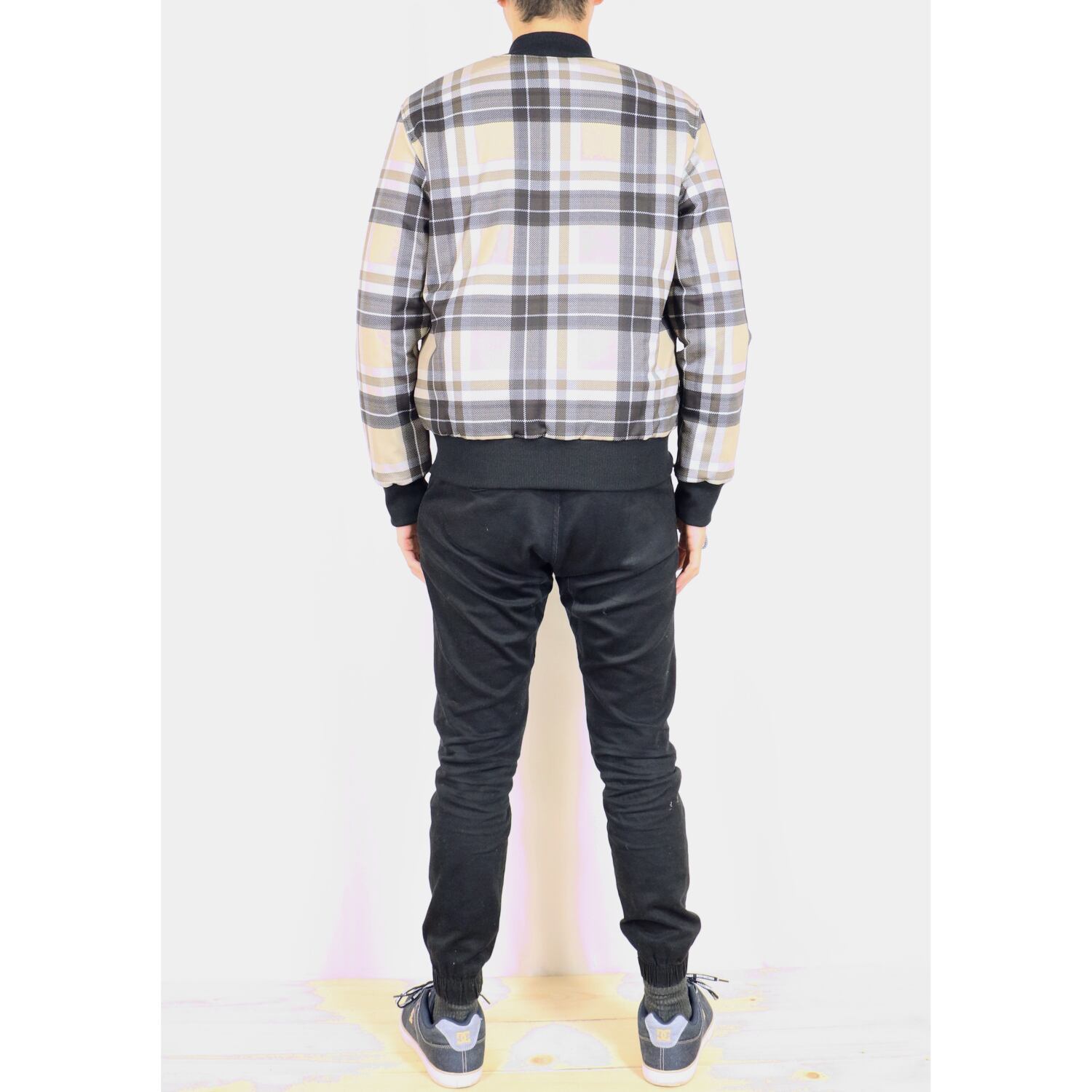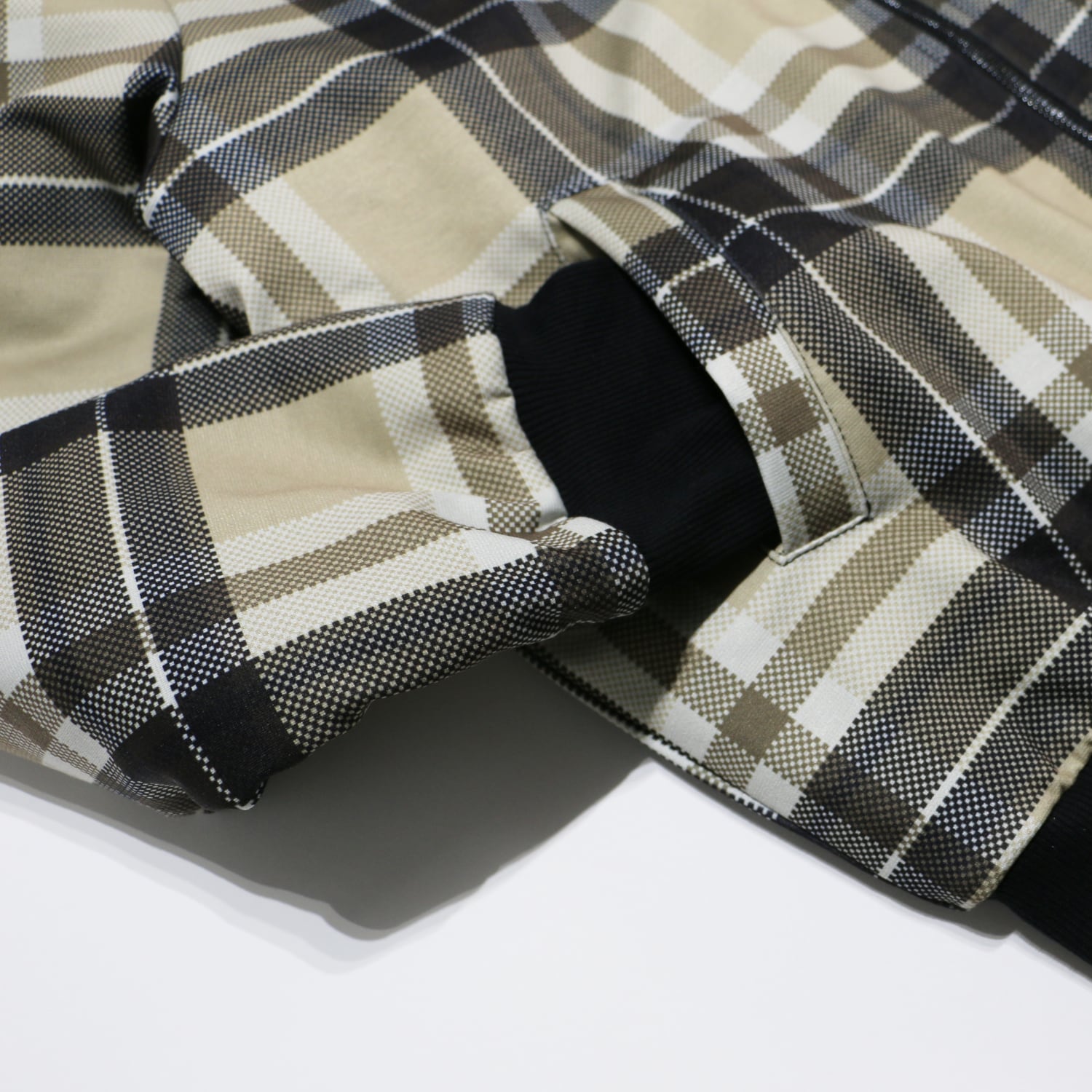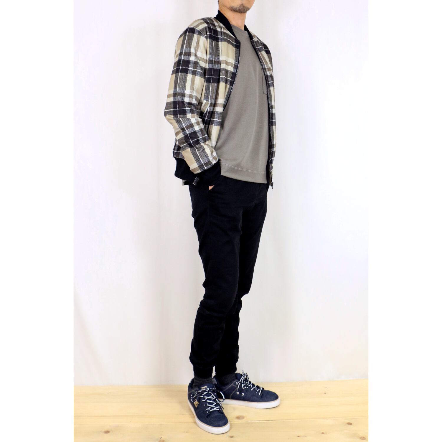 定番のMA-1風デザインに、オシャレなチェック柄を合わせたブルゾン。メッシュ風の織り柄でスポーティーなイメージ。普段着からオフィスカジュアルまで。内側は中綿キルティング仕様で防寒着としても使えます。表地と同じ生地の内ポケット付き。