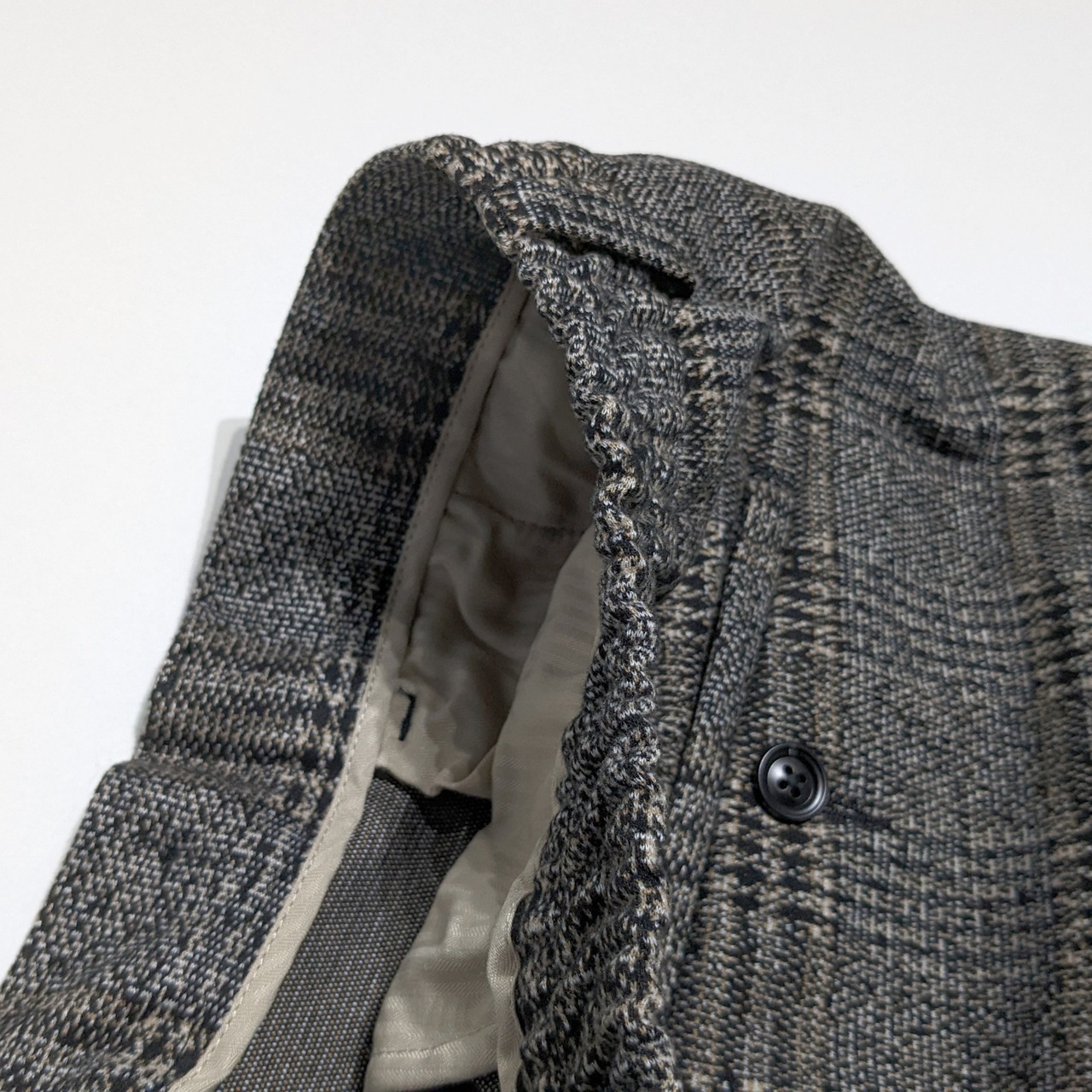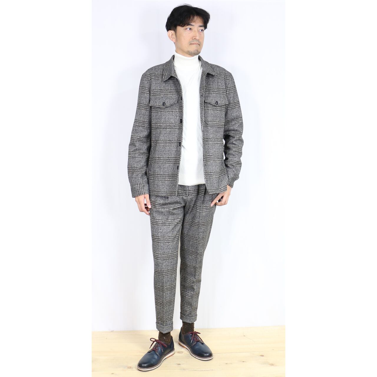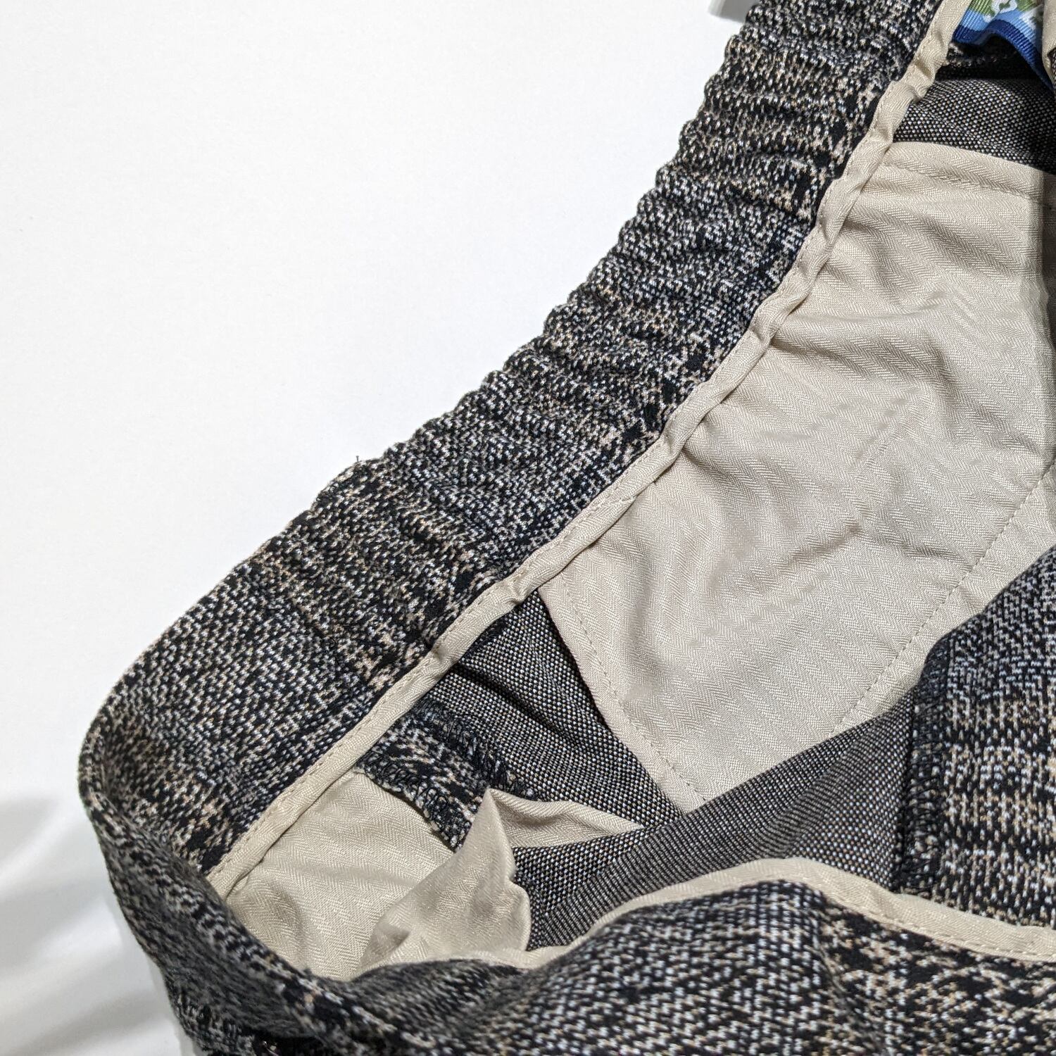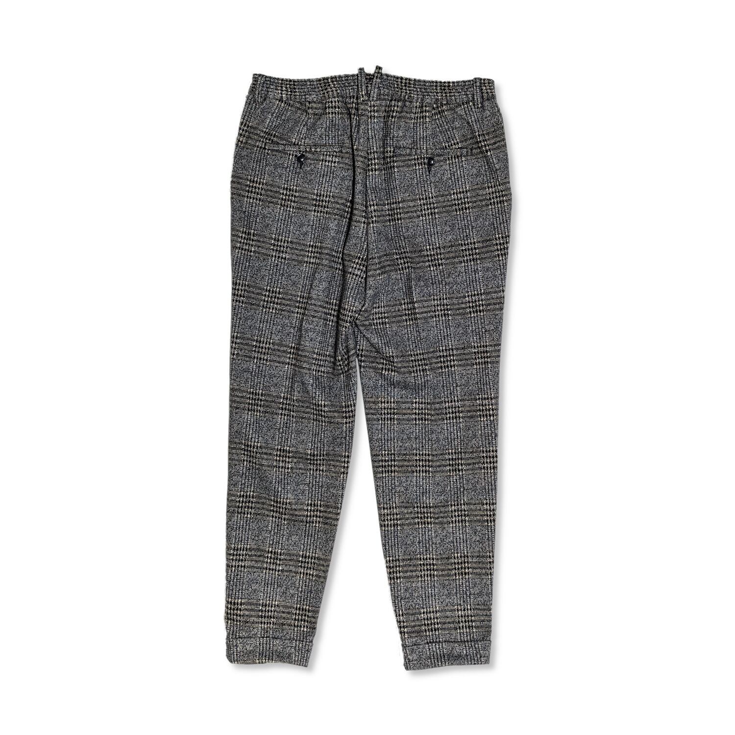 裾がタイト&ダブル仕上げの9分丈パンツ。ウエスト背面はゴム仕様で余裕があり、腰で穿く感じがおススメ。ベルトを使ってウエストジャストに合わせる場合は、見える足首にカラフルな靴下を入れて遊ぶのも面白い。