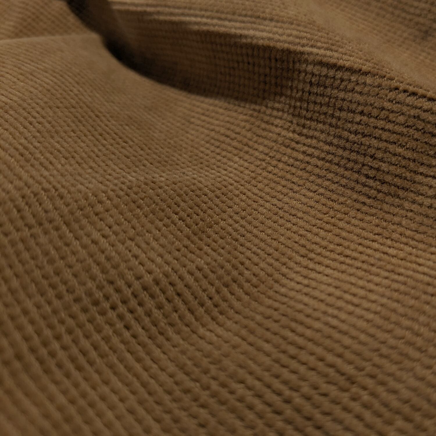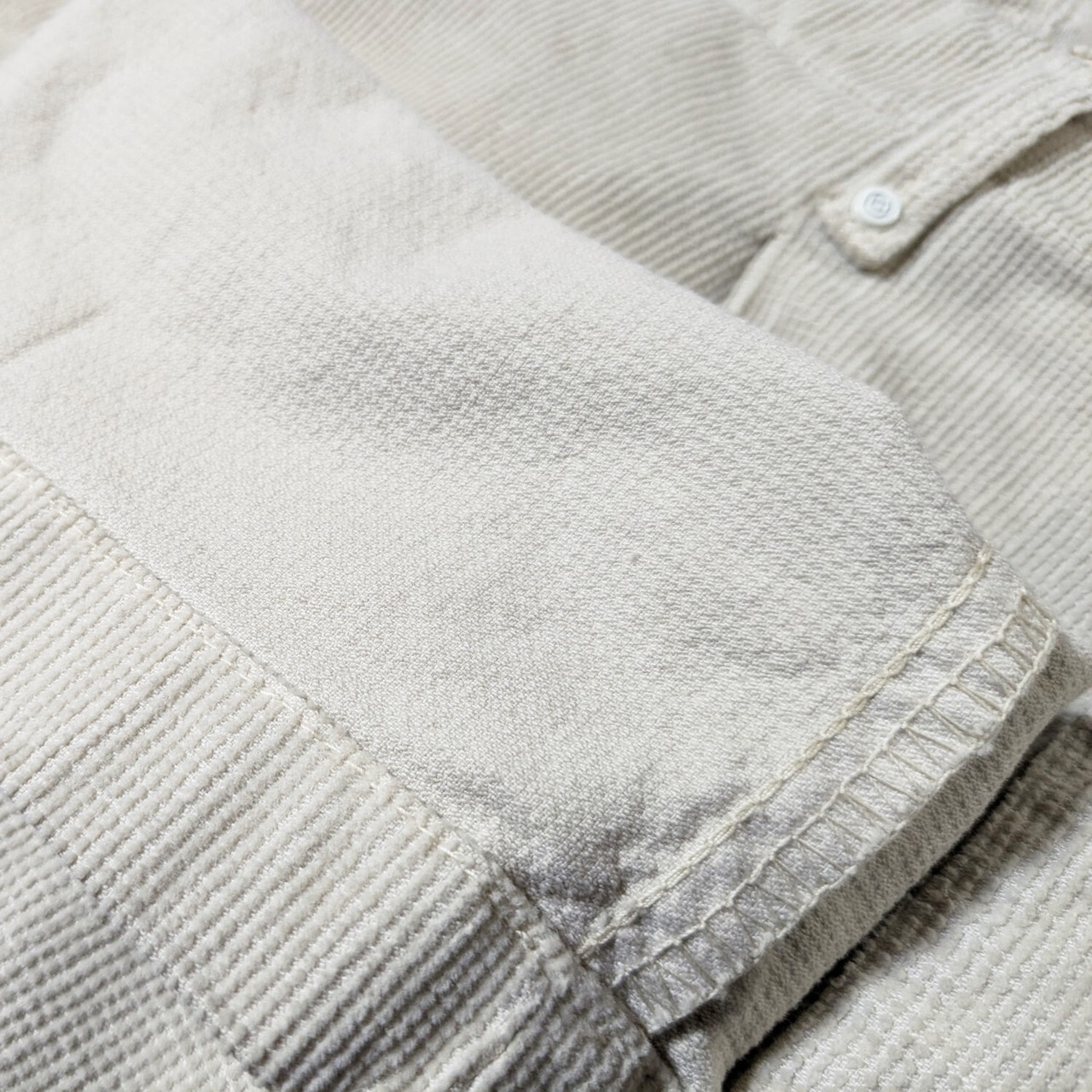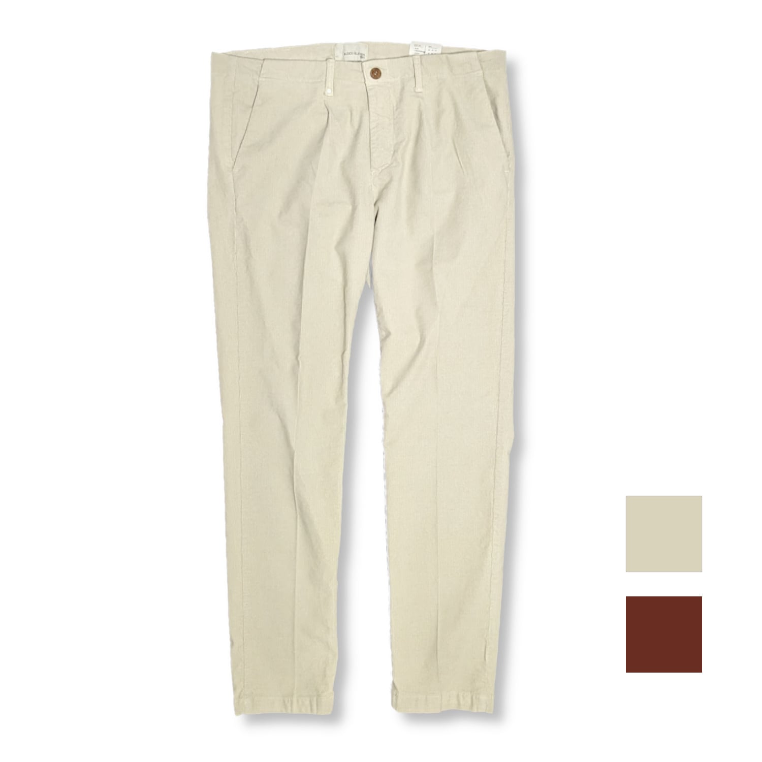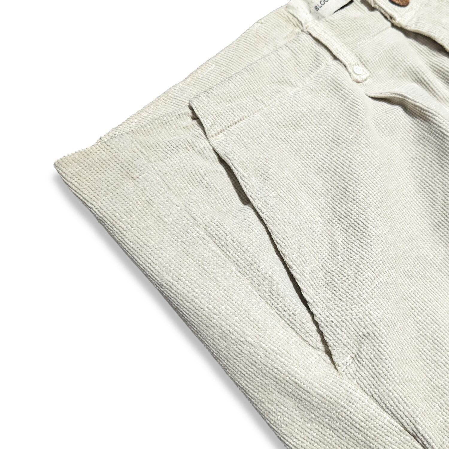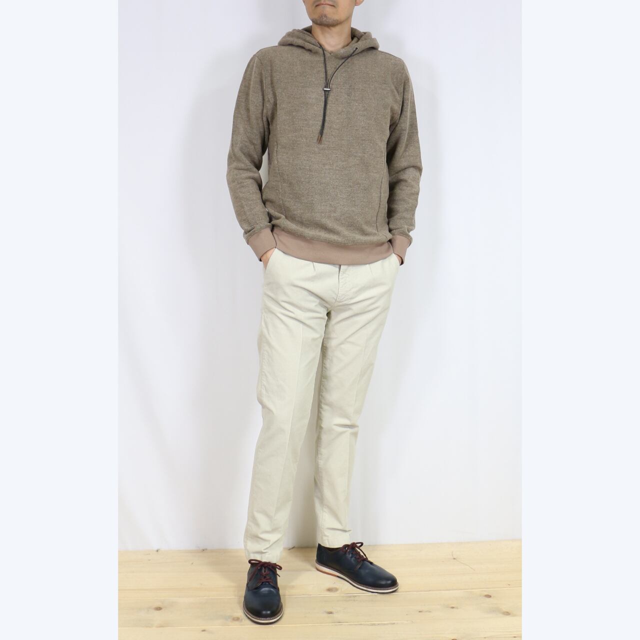 パイル地を細かくカットした、とても上品な風合いのパンツ。裏側はシャリ感のある綿の肌触り。ストレッチも効いていて快適に着用できます。ウエスト位置はやや下の、腰で穿くタイプ。