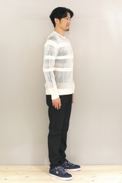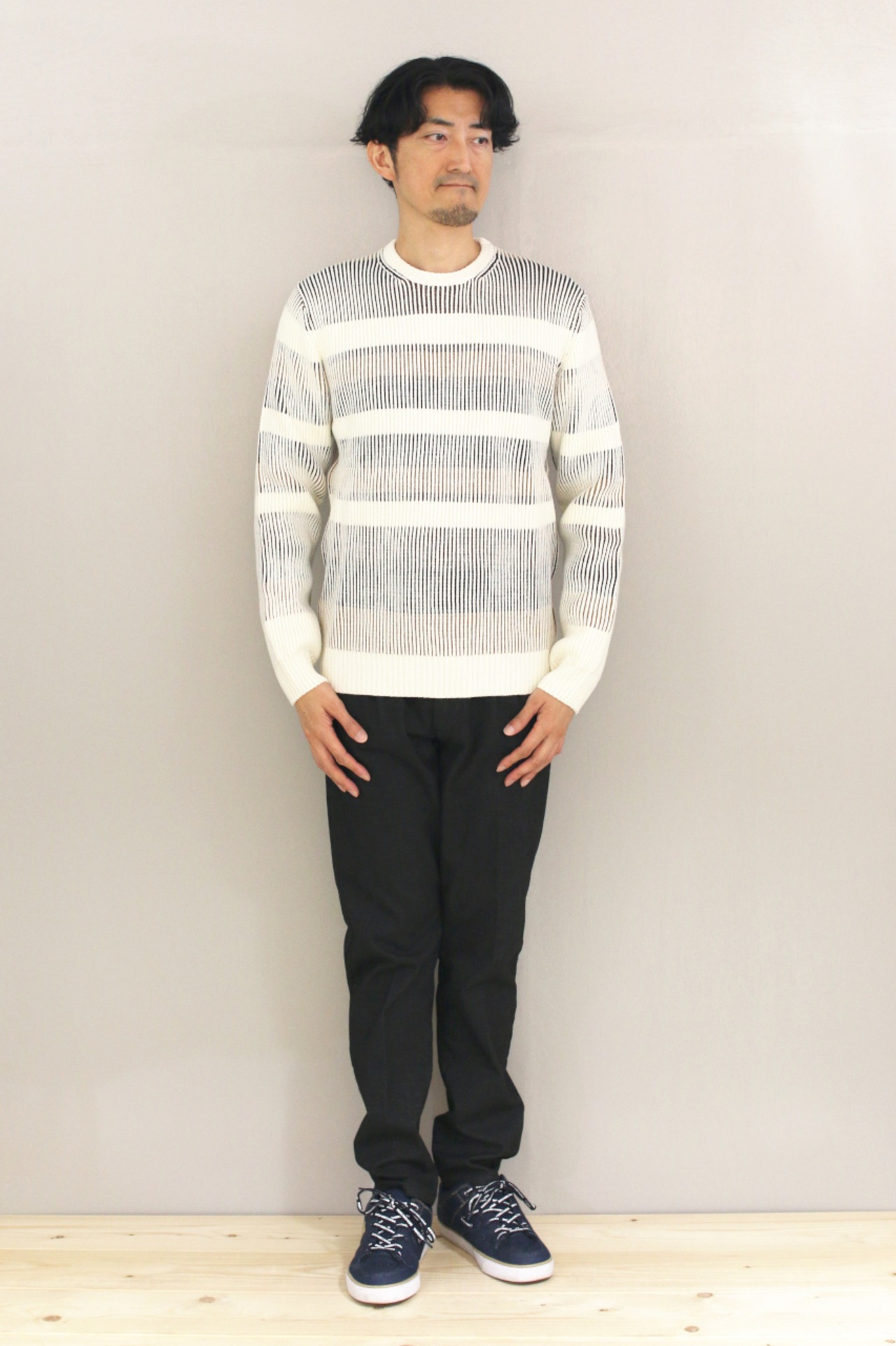 着用時の伸縮差でボーダーの見え方が変わる、遊び心のある大人のセーター。
